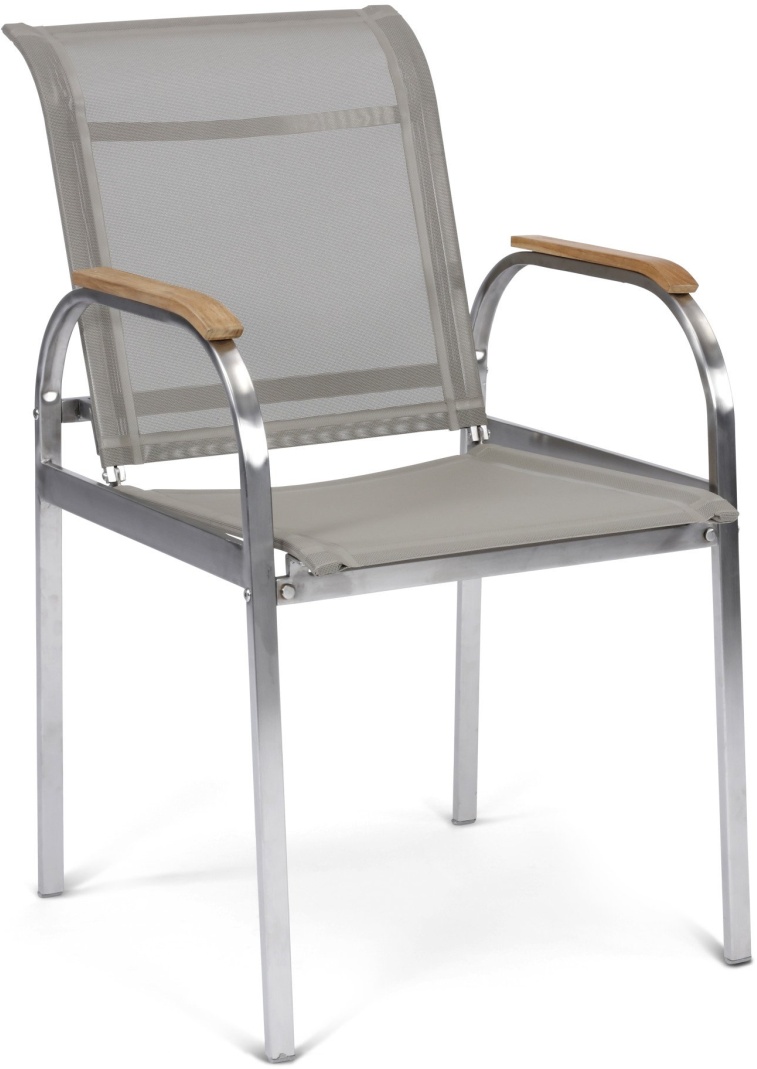 Lounge outdoors in comfort and style with the Aruba dining chair. This chair features a weather-resistant polished stainless steel frame, and the solid teak arm pads are finished with natural linseed oil to be water-resistant.Read More