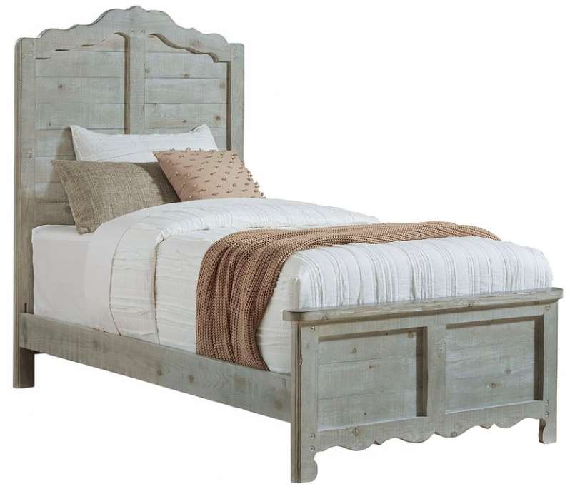 This bed features flowing molding that captures horizontal solid wood planking. Footboard features scalloped base molding. Mint finish is hand applied on rough sawn pine to achieve a vintage, one of kind look.Read More
