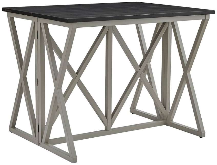 Table top finished in a clean modern graphite color and bases in a handsome khaki. Table is hinged to fold in for a more intimate space for two or out for a family of four. Either way is perfect for your home.