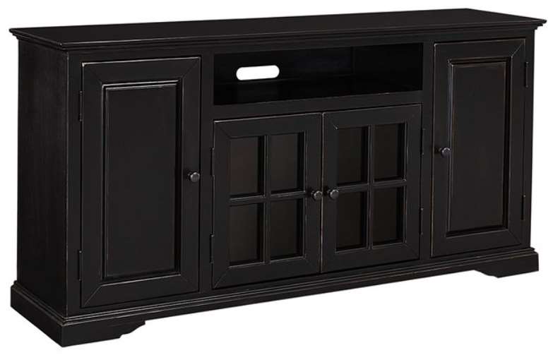 Features include a sound bar shelf, under top molding with a bracket foot base, mitered doors with paneled inserts, center glass window pane designed doors, adjustable shelving, cutouts in the back for easily accessible cord management, and graphite finished knob hardware.