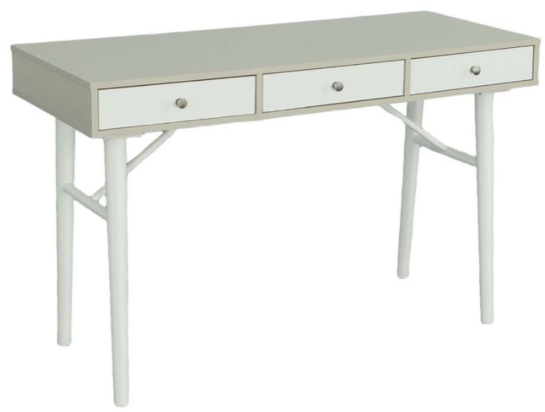 The perfect desk if simple, clean, transitional function is your need. A sophisticated Mid-Modern design with round tapered legs in a very hip Gray & White combination finish. Includes 3 spacious drawers with metal guides and sleek hardware in a Brushed Silver finishRead More